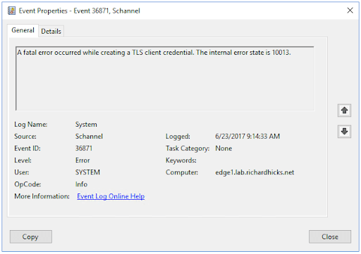 The internal error state 10013 indicates a failure in creating a TLS client credential, often due to incompatible TLS versions or cipher suites.