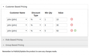 The plugin follows the following order of priority Customer Based Price, User Role Based Price, Group Based Price, Regular Price with customer based price getting the highest priority. So if a user belongs to a group as well as a role to which custom prices have been applied then the user can purchase the product at the price set for the user role assigned to him.